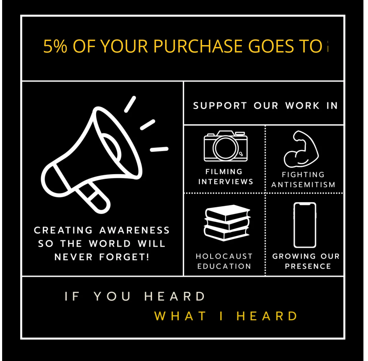 If You Heard What I Heard is the first and only nonprofit dedicated to filming the stories of grandchildren of Holocaust survivors, the last generation to ever hear survivor stories firsthand. Their mission is to ensure future generations never forget about the Holocaust, its victims, its survivors, and its lessons, so that it never happens again.